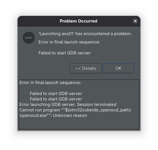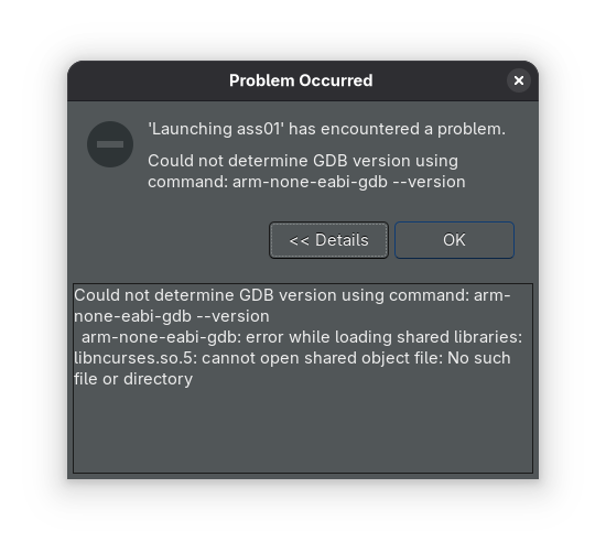 First I got a message to update the debugger firmware. After doing this, I still got an error. It could not determine the GDB version.