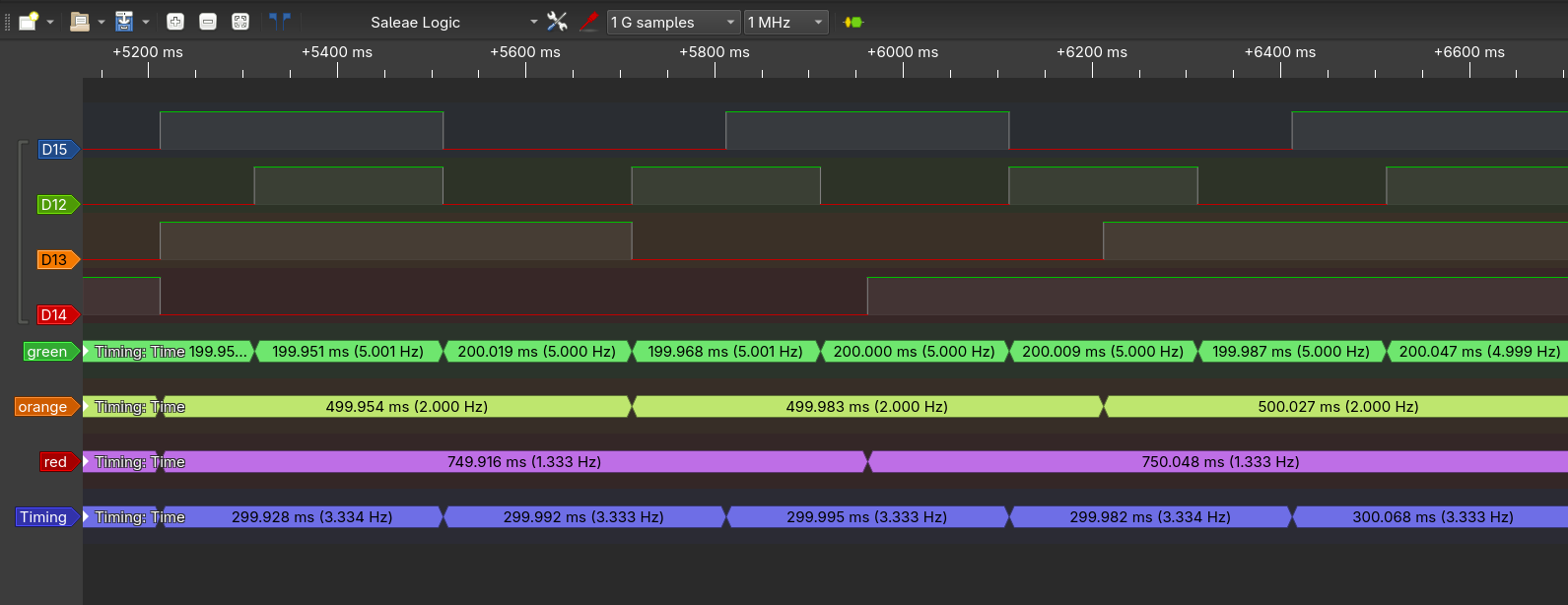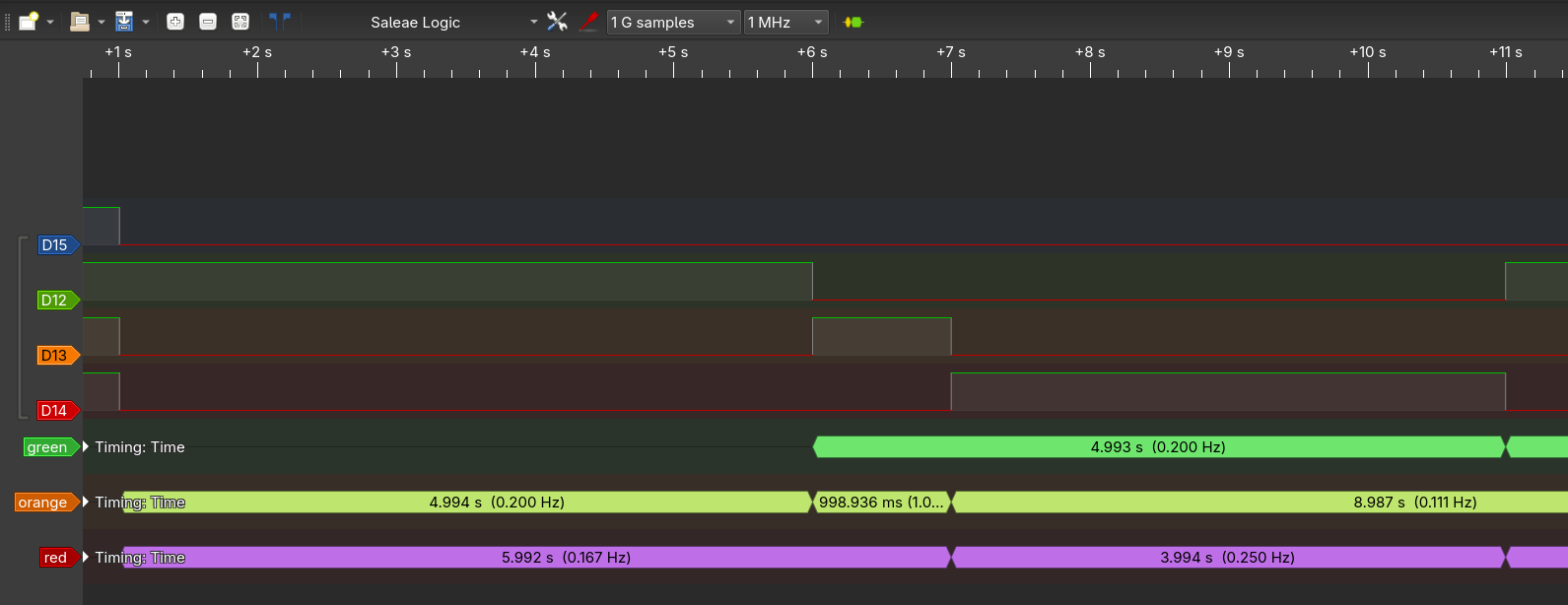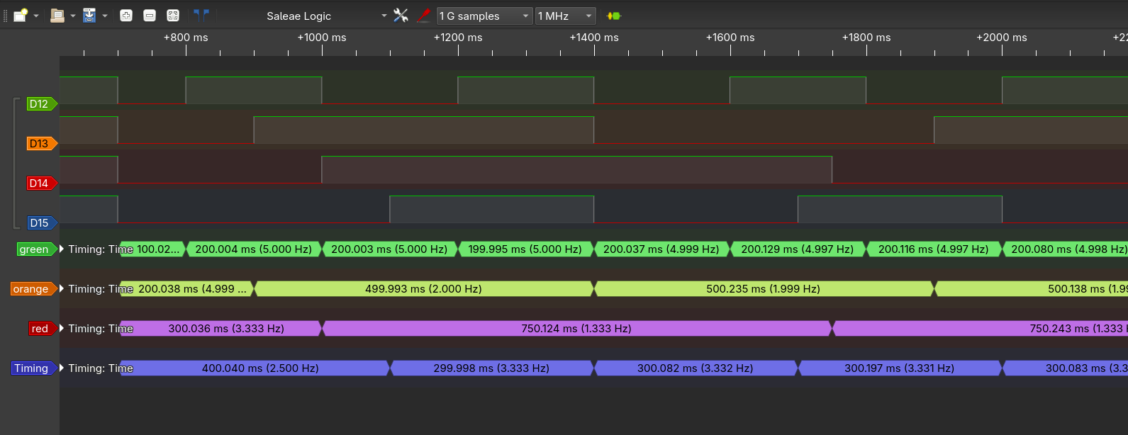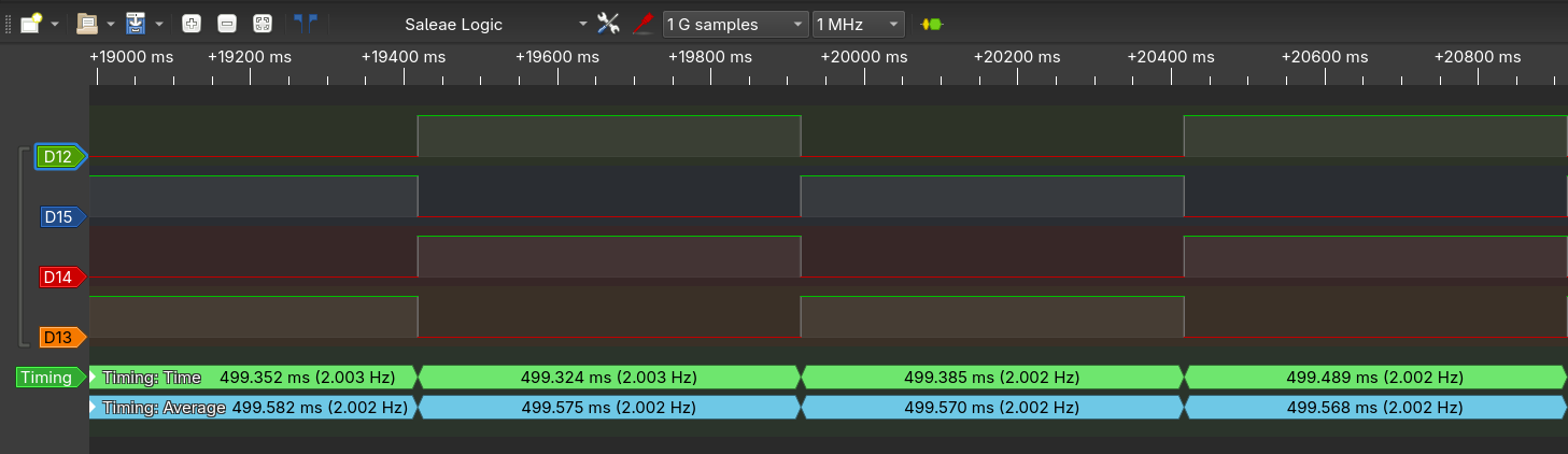 I measured the resulting frequency with an logic analyser (figure \ref{31_logic}; channels are coloured to the led colour). It measured a period time of 499.568ms, I call this error could be my cheap logic analyser or en error in the internal oscillator.