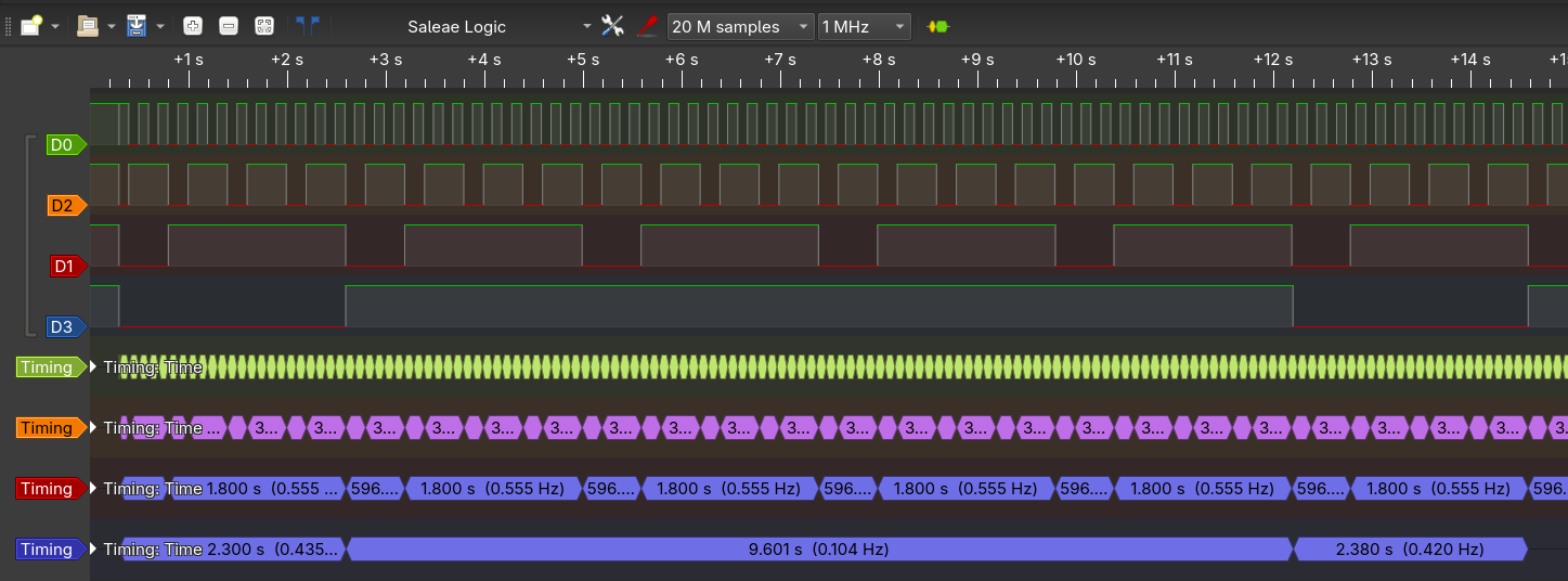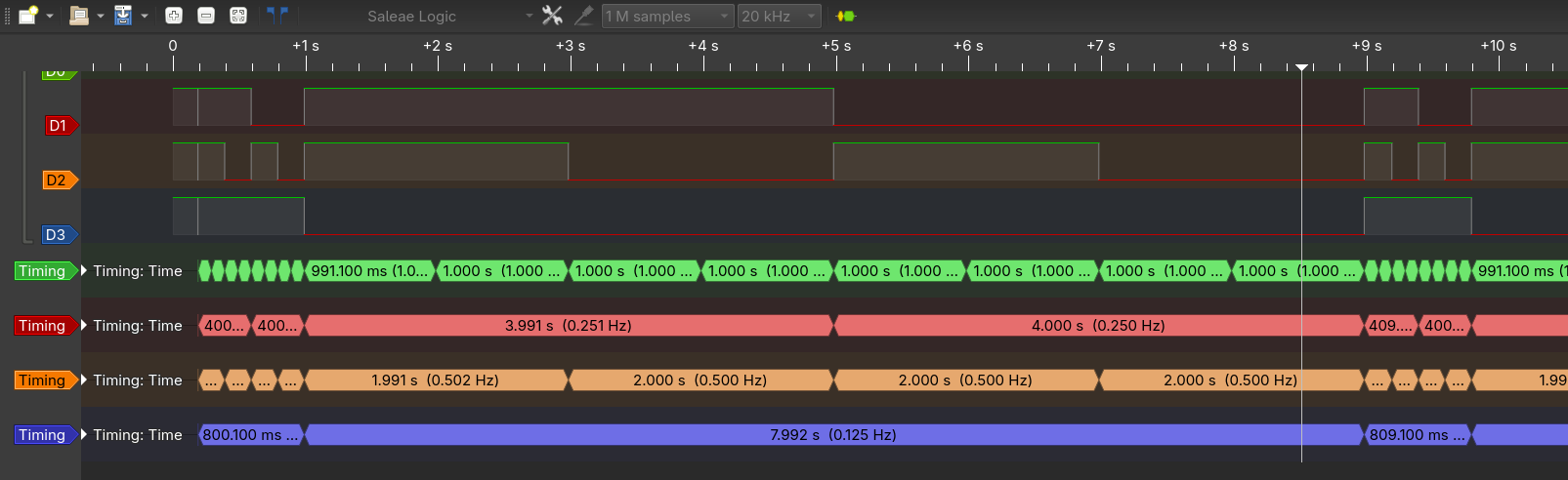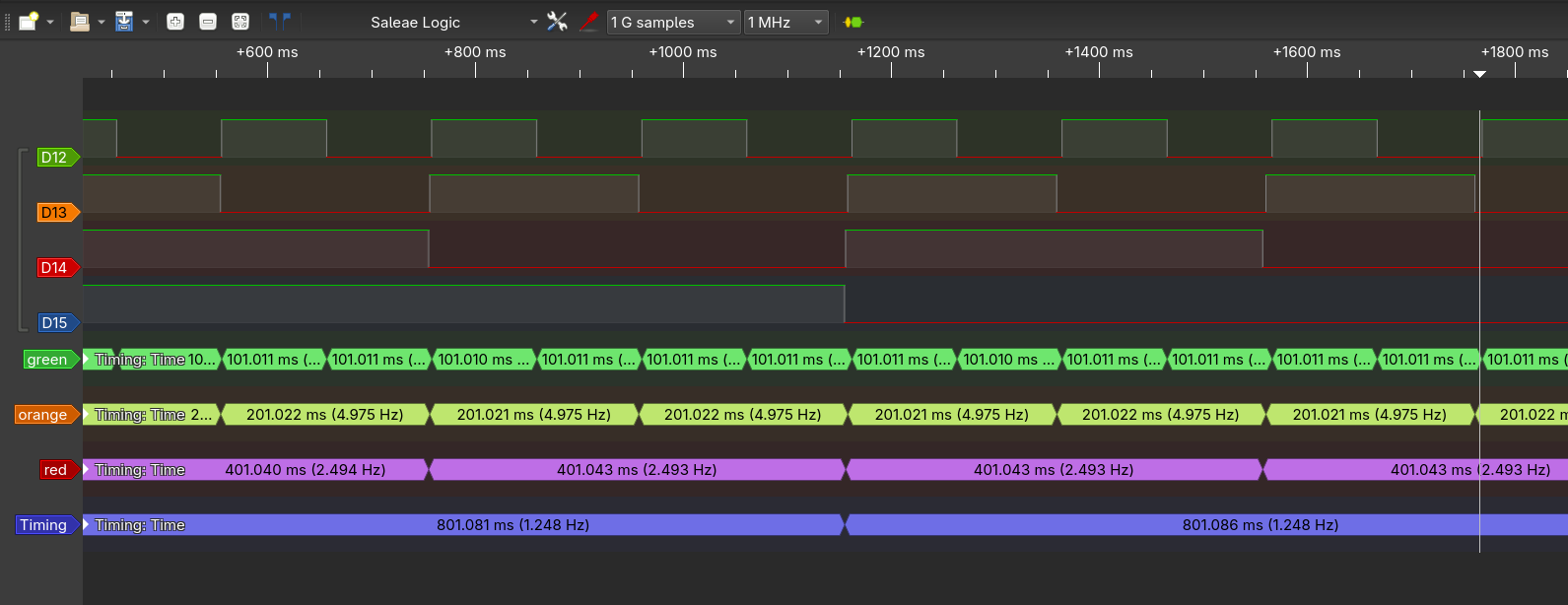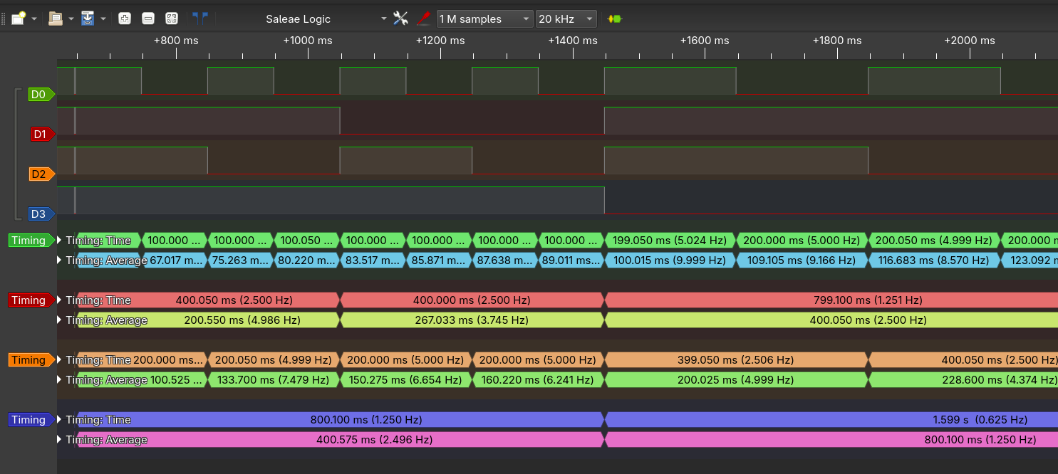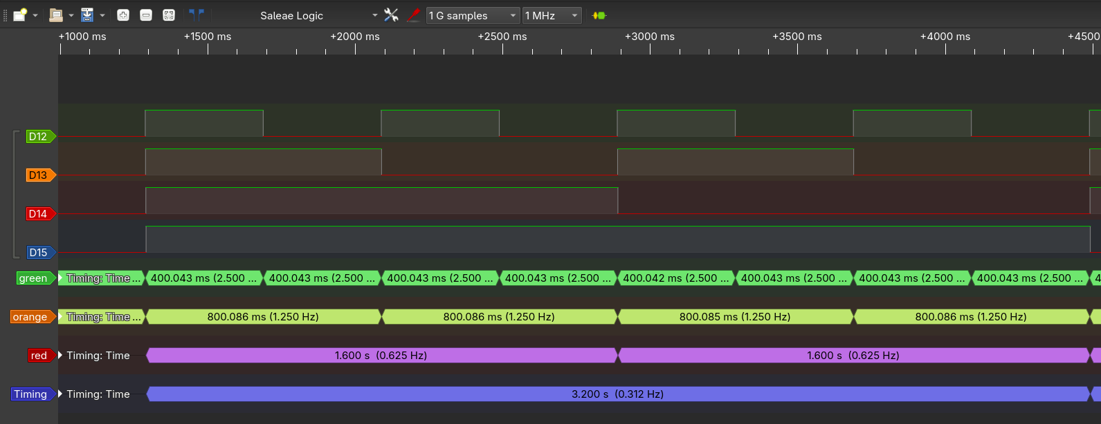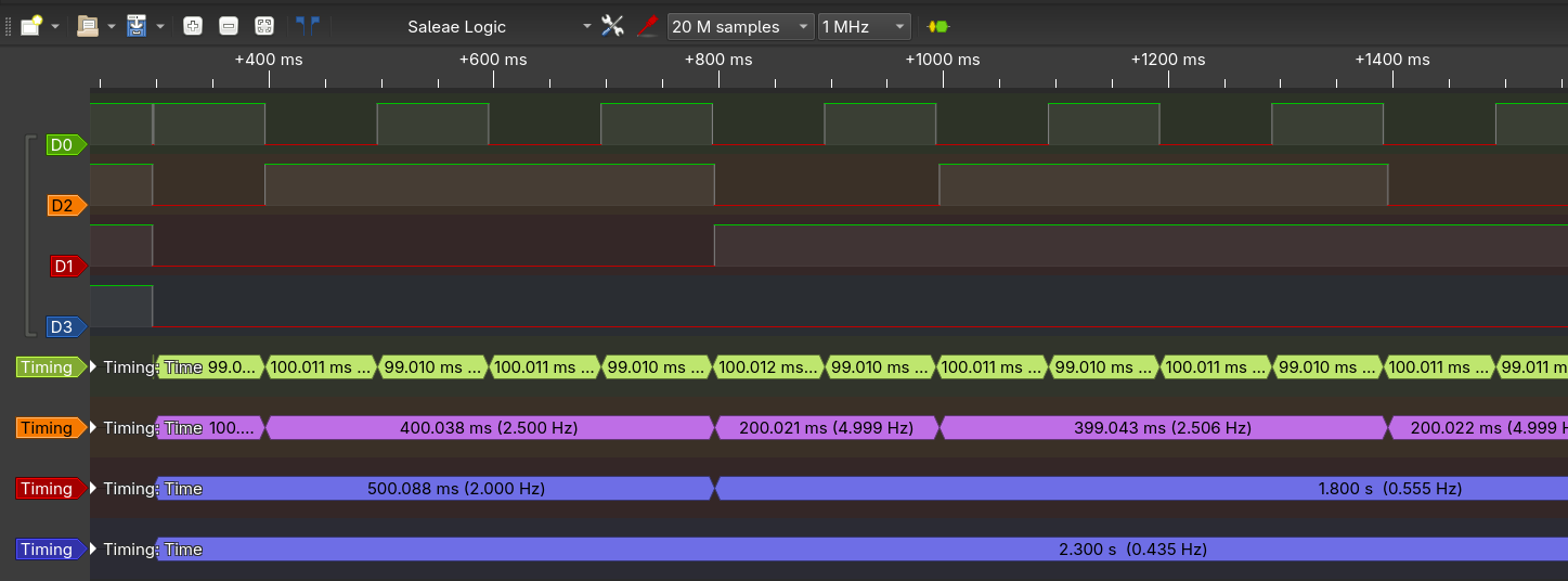 This implementation works, only the delays are a bit off. To make it a nice counter again all delays should be decremented by one (figure \ref{42_logic} shows the output with the original timings, not the decremented ones). This is because with my implementation there is a delay added until the next SysTick after delay is called. blocking_delay(0) instantly returns without waiting for an SysTick (code below). It check if the counter is zero before waiting. For my delay(0), it does wait for a SysTick and checks the counter after. To me the added delay make more sens. My delay is between number of the arguments in SysTick up to one extra, depending how long until the first SysTick is.